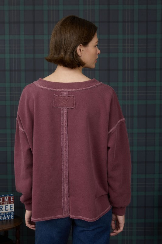 Cozy soft sweatshirt with fun details. Shorter length, exposed seam, vneck! So cute!!